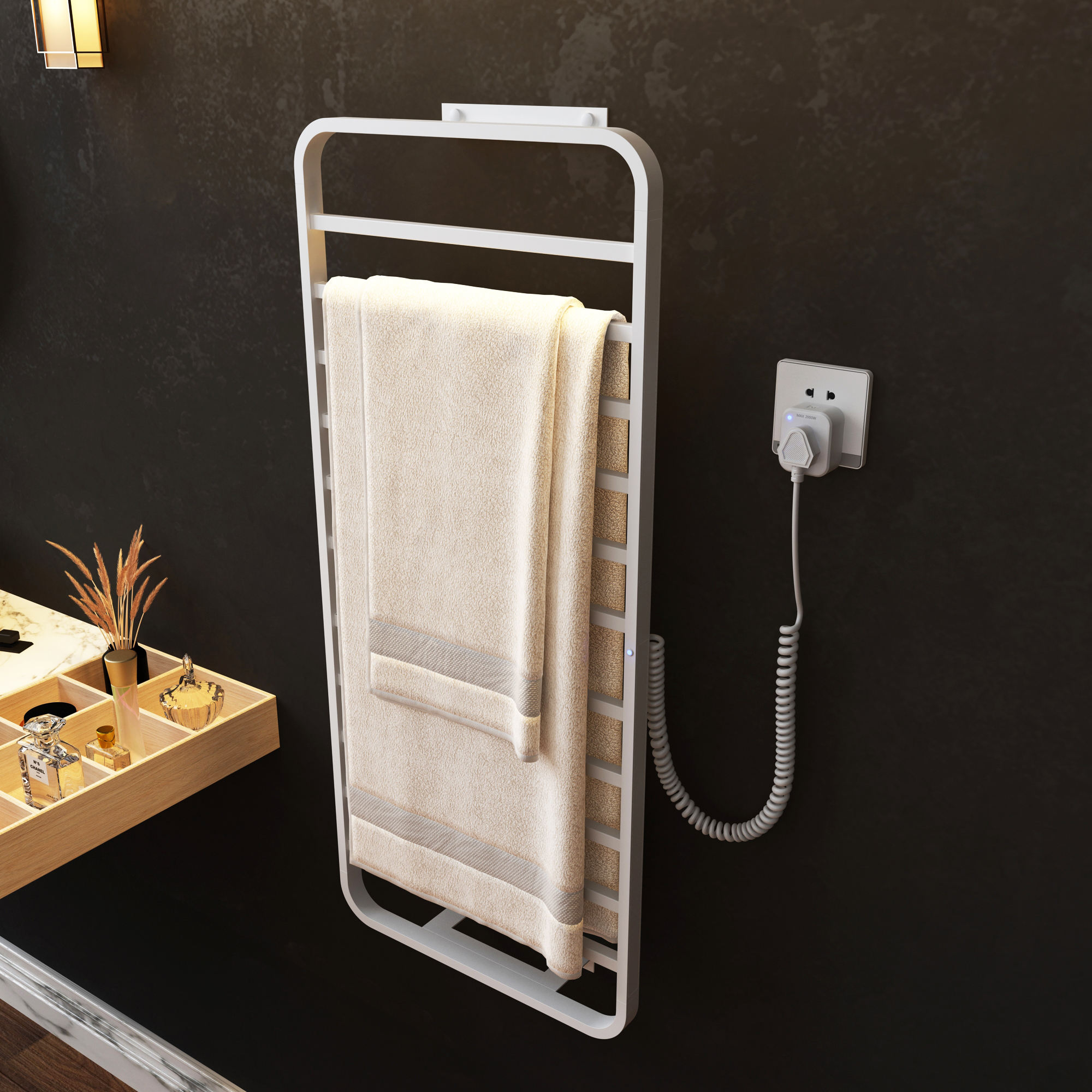 I'm reaching out to request a replacement for an electric towel heater component that I've recently lost. Specifically, I need a grey electric box cover to replace the missing part. It's crucial that the replacement matches the original in terms of functionality and appearance.