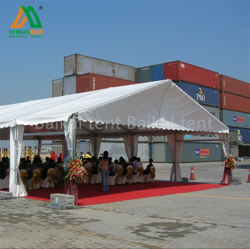 寻找用于户外活动的婚礼帐篷。需要规格、价格、最小起订量、交货时间和配件。需提供阻燃和防紫外线认证。请发送产品目录和照片。